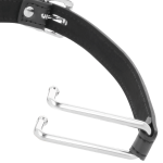 Esta mordaça tem tiras de couro de qualidade e costuras elegantes ao longo das tiras. A alça possui furos para ajustar o comprimento. Tamanho único serve para todas as medidas.