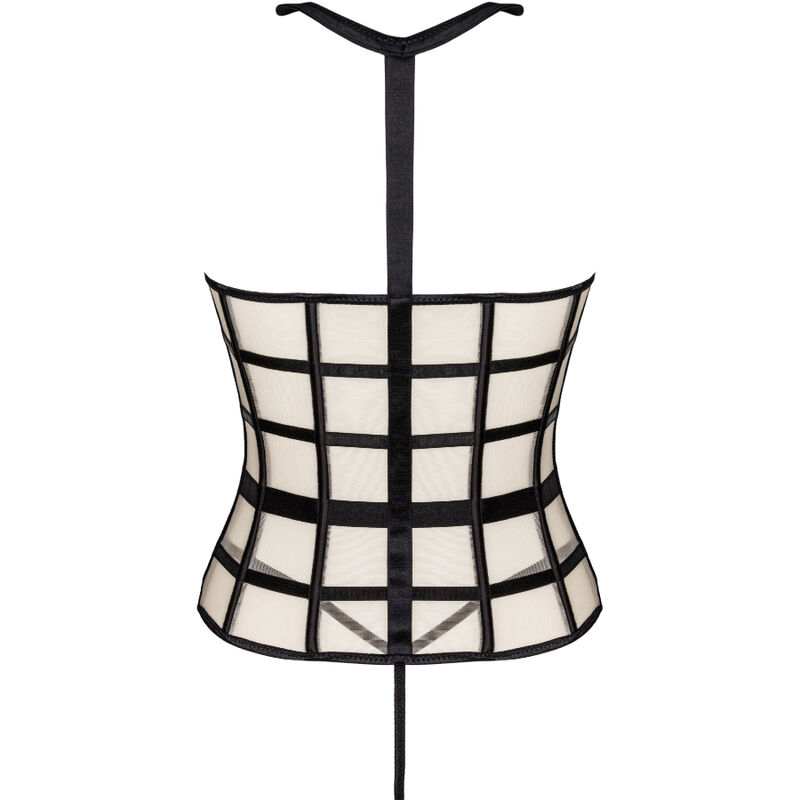 Um conjunto de duas peças composto por um espartilho sensual e busty e uma tanga preta sexy. O espartilho tem um zíper na frente, tornando-o fácil de vestir. As cores do conjunto são preto e bege, que juntos criam uma combinação atraente. Também vale a pena prestar atenção aos detalhes tentadores, como uma gola preta ou cintos pretos dispostos de forma a destacar melhor a cintura. O que mais se destaca neste espartilho são os recortes que expõem o busto. Isso torna todo o conjunto muito ousado e provocativo. Não resta muito para a imaginação. Os adesivos de mamilo serão uma ótima adição ao jogo e adicionarão um pouco de tempero.